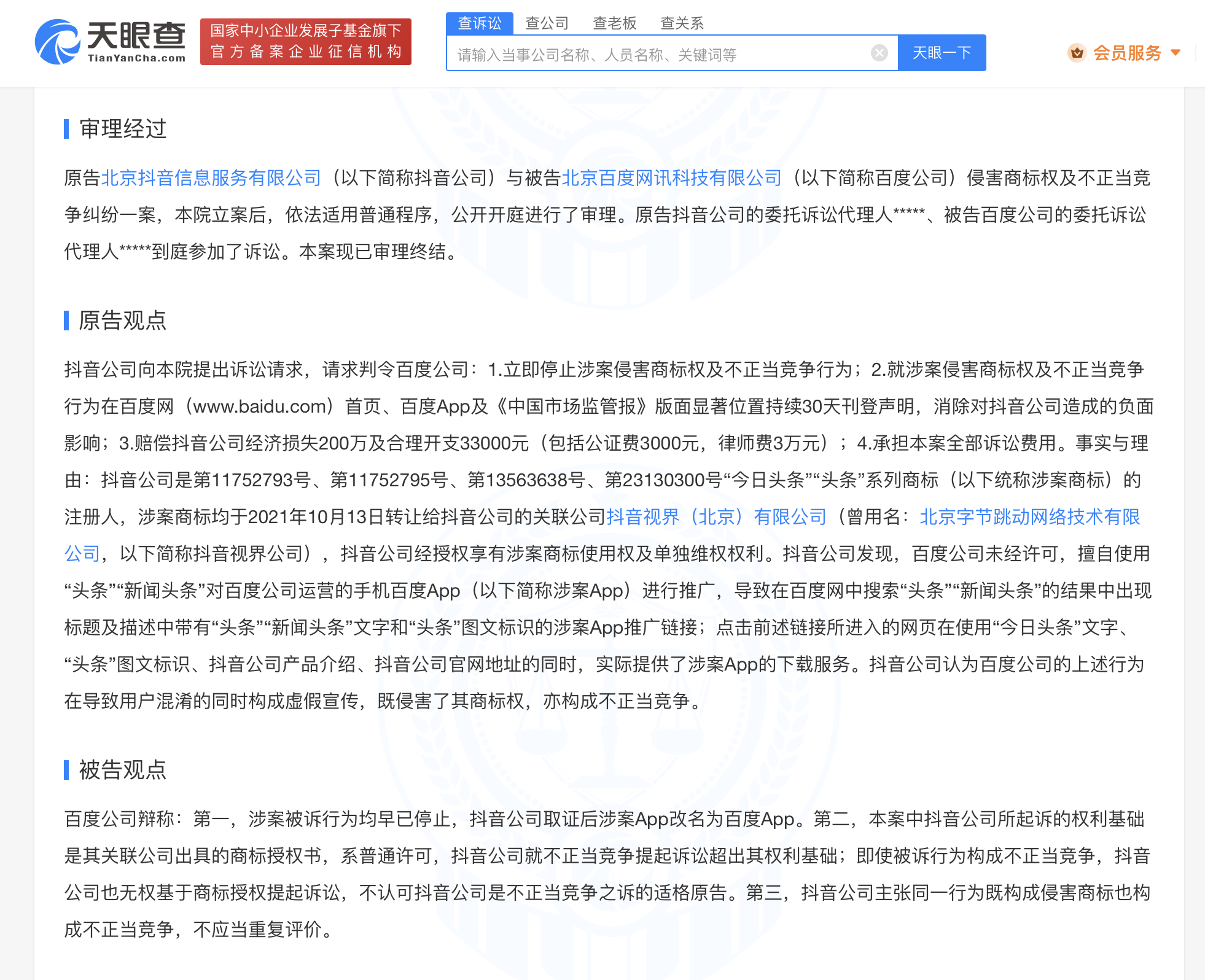 文书显示,原告抖音公司诉称,抖音公司为多个“今日头条”“头条”商标的注册人。百度公司未经许可,擅自使用“头条”“新闻头条”对“手机百度”App进行推广,导致在百度网中搜索“头条”等的结果带有涉案App推广链接及下载服务。抖音公司认为,百度公司的行为在导致用户混淆的同时构成虚假宣传,既侵害其商标权,亦构成不正当竞争。百度公司辩称,涉案被诉行为早已停止,抖音公司取证后涉案App改名为百度App;抖音公司就不正当竞争提起诉讼超出其权利基础。